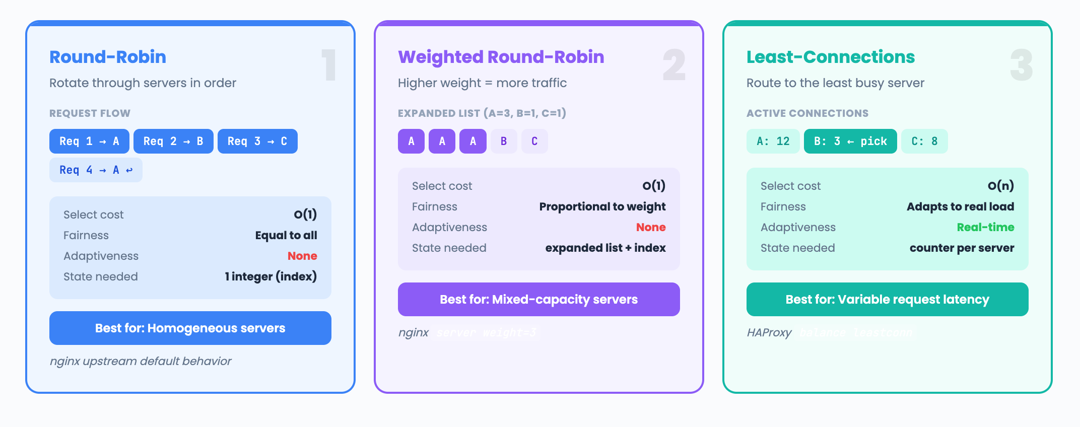 Round-robin, weighted, and least-connections — three algorithms you configure in nginx every week, now built from zero