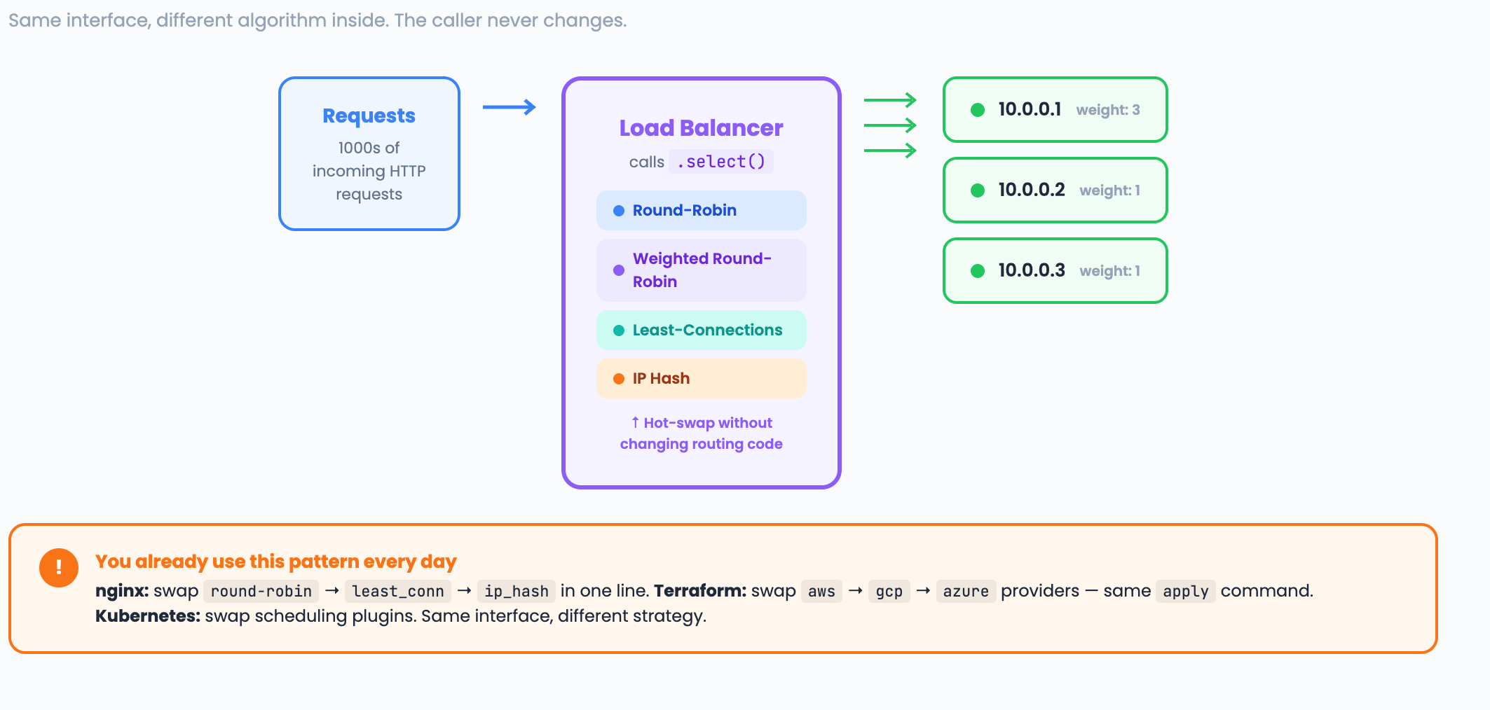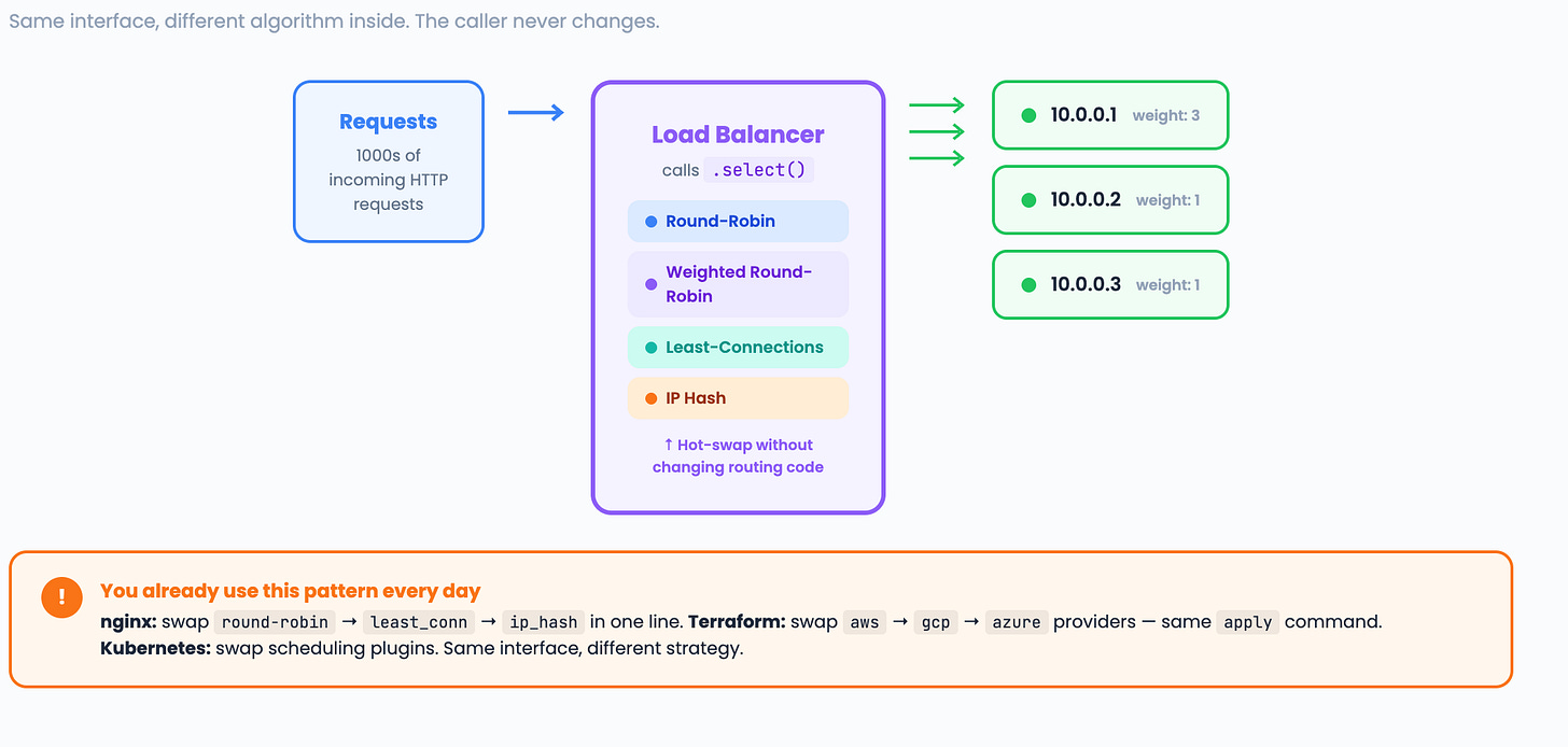 Before we write any load-balancing code, let us build the pattern that holds it all together. The Strategy pattern is one of the most useful patterns in system design interviews — and one you already use daily.