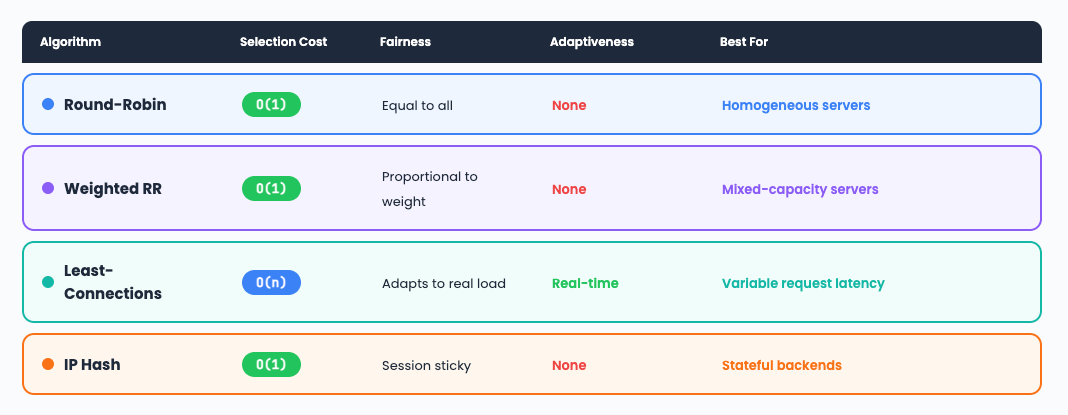 The release() pattern: The caller must notify the load balancer when a request completes. This is how HAProxy’s leastconn and Kubernetes’ endpoint tracking work.