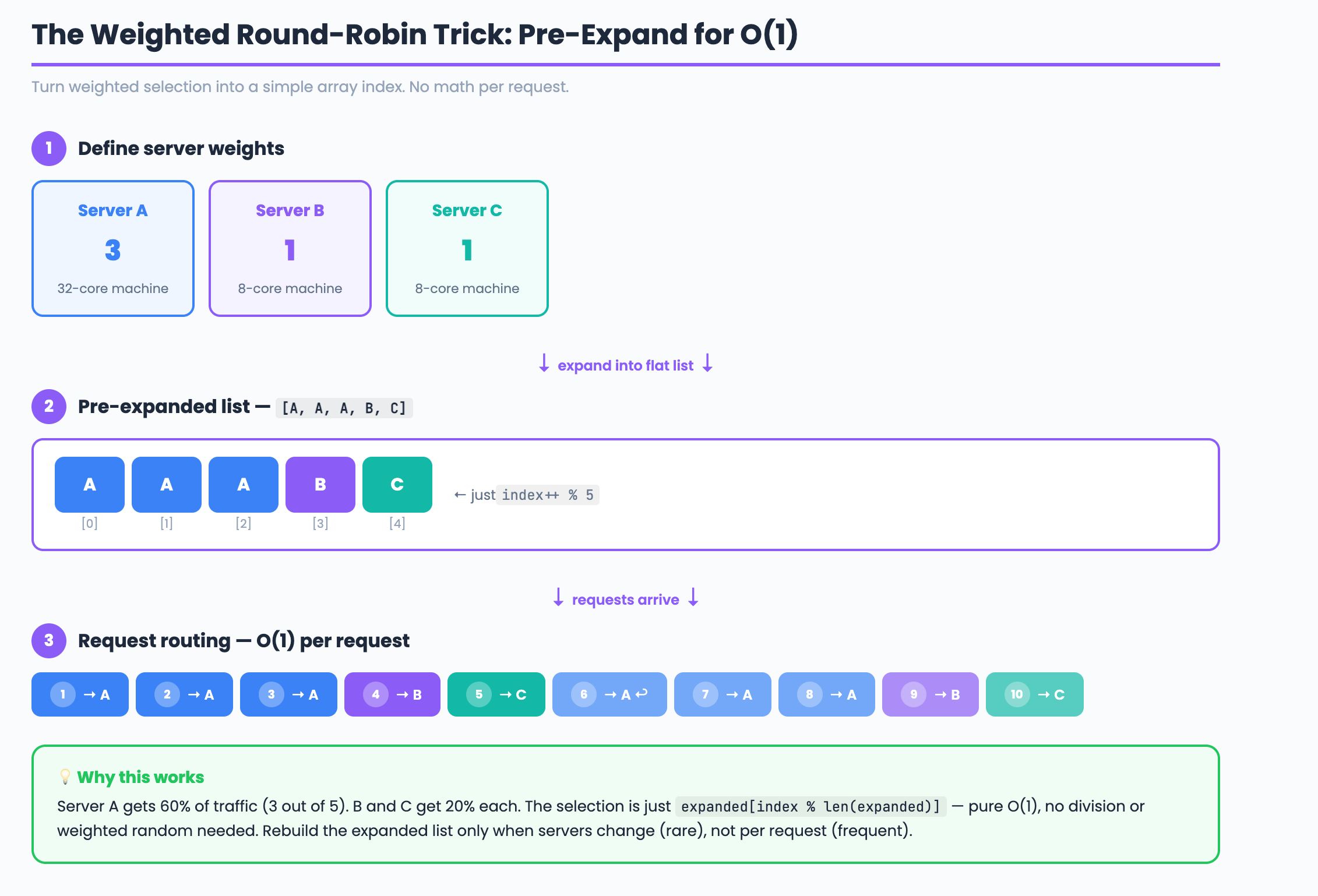 The trick: Pre-expanding weights into a flat list turns weighted selection into a simple array index. No math per request.