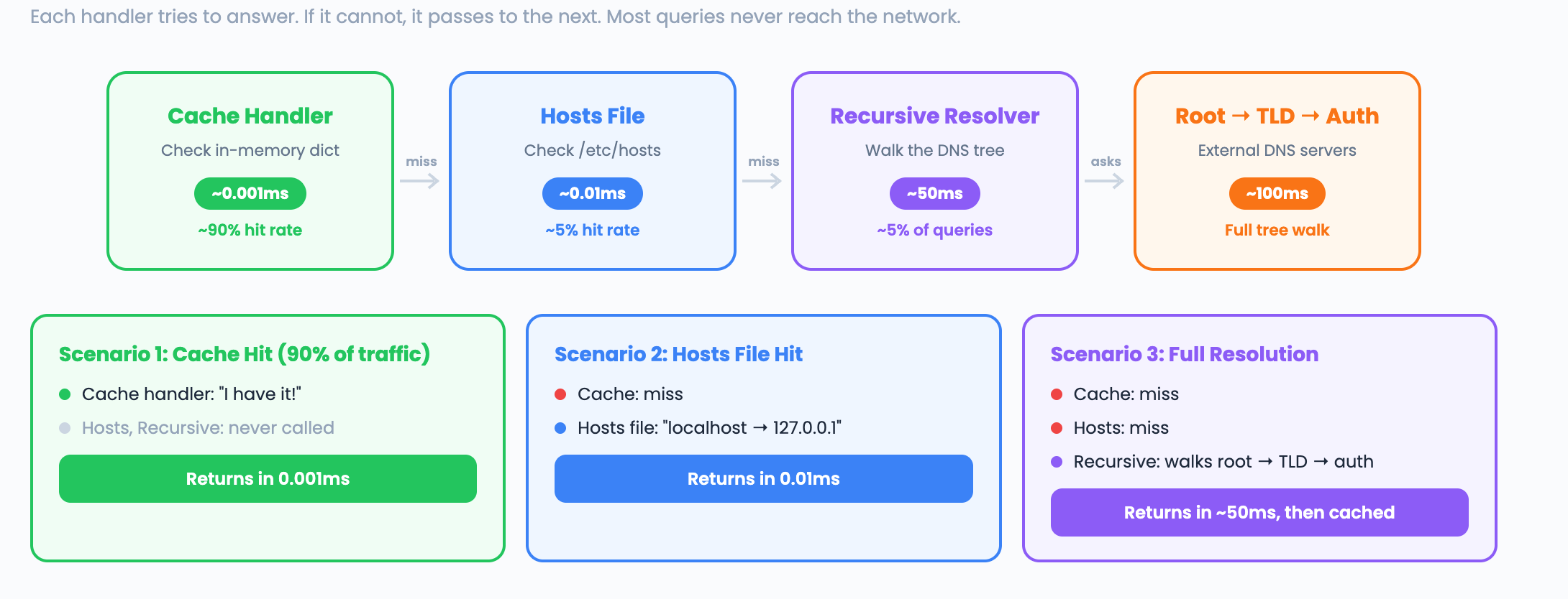 Most queries hit the cache handler and return in microseconds. Only cache misses reach the hosts file handler. Only misses from both reach the recursive handler which makes network calls. This is the same layered lookup your operating system uses: