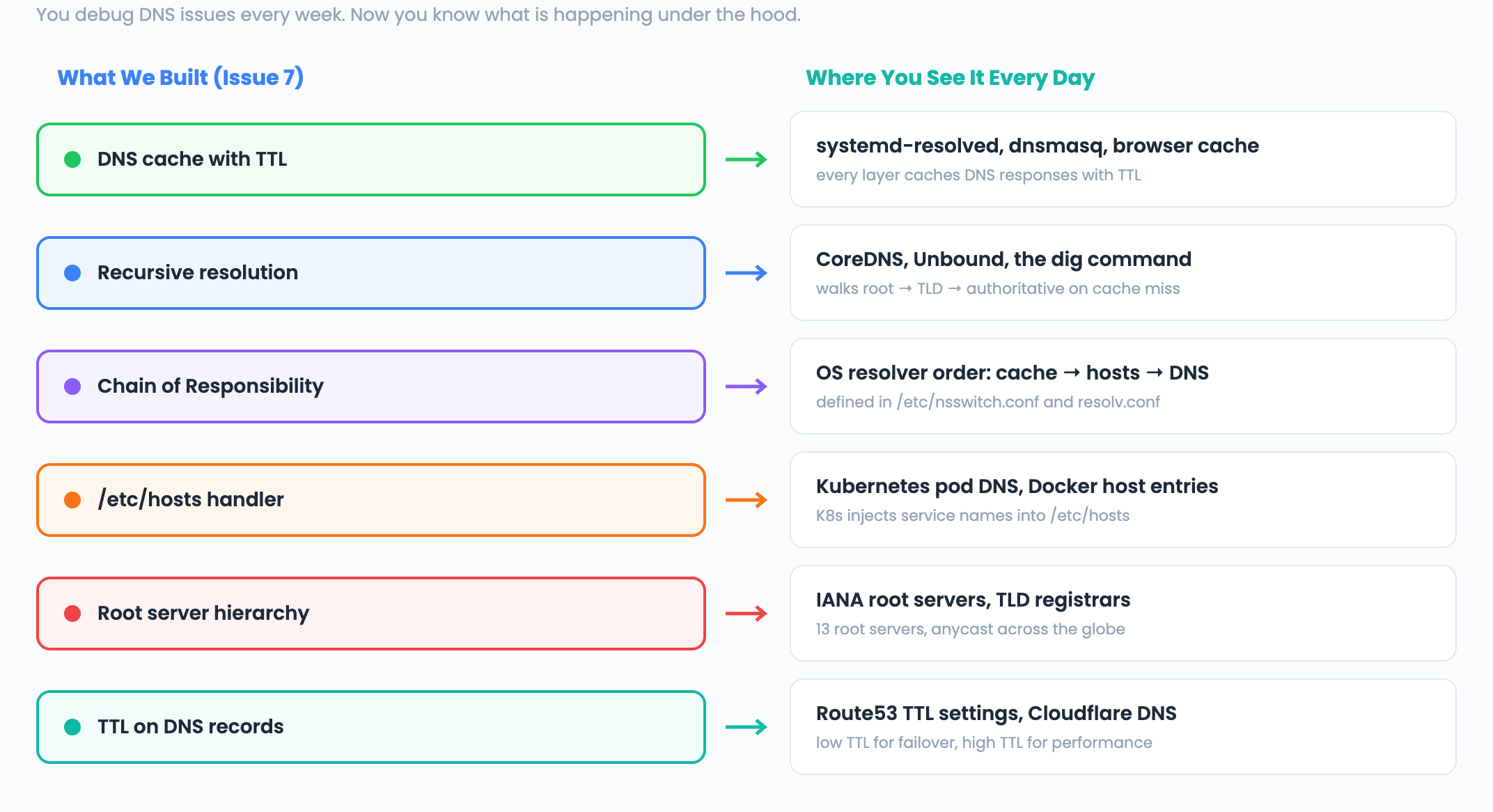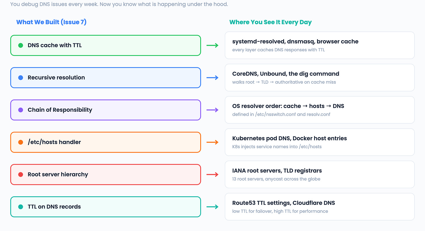 Today we build one from scratch. A DNS resolver with TTL caching and the Chain of Responsibility pattern.