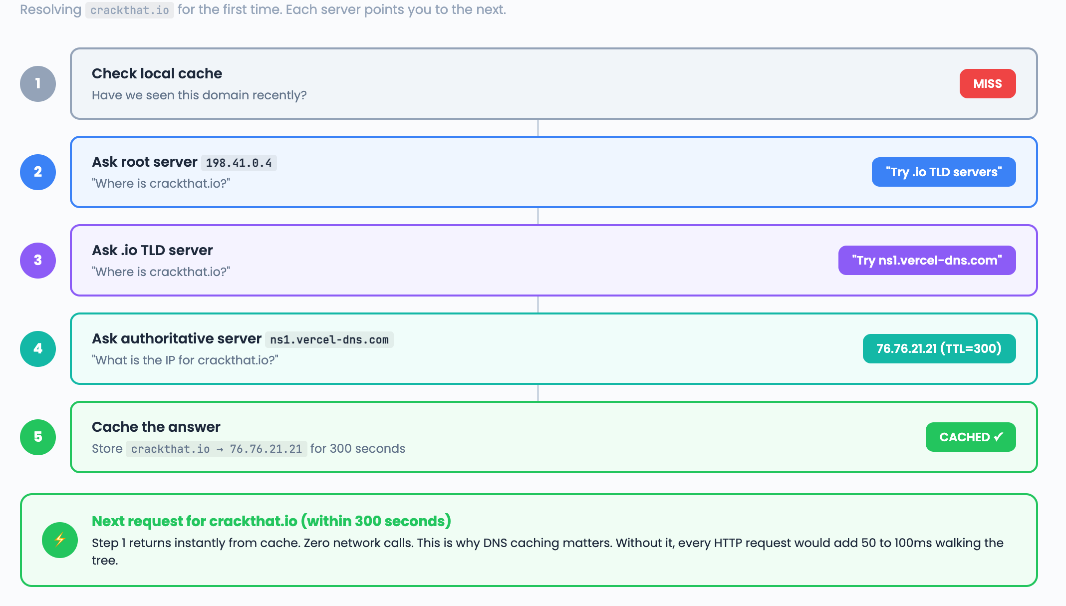 The key insight: after the first lookup, Step 1 returns the answer instantly for the next 300 seconds. Without caching, every HTTP request would add 50 to 100ms walking the DNS tree.
