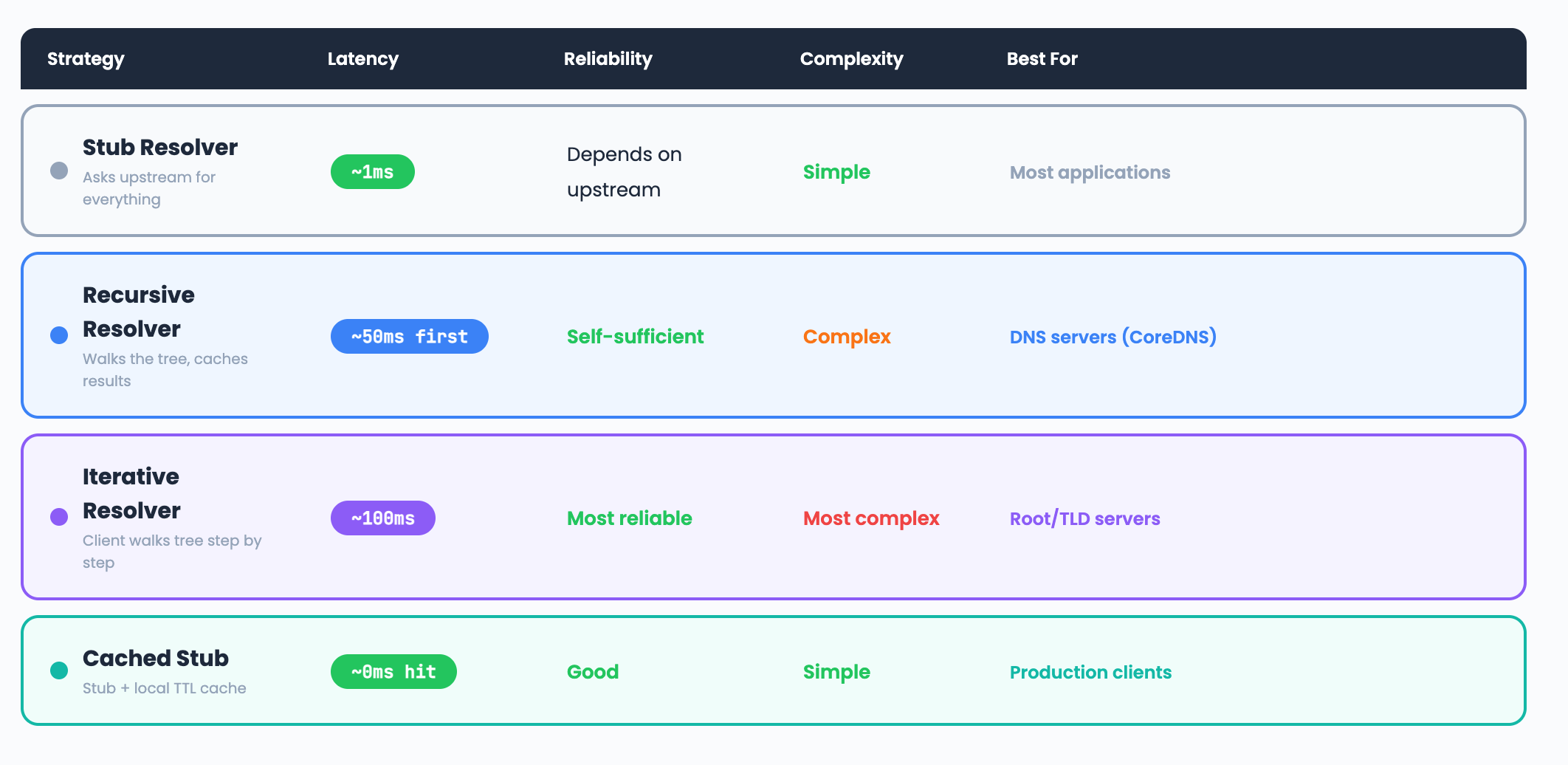 In production DNS servers like CoreDNS or Unbound, the resolver builds raw UDP packets and walks the tree from root servers to authoritative servers. Our implementation delegates to the OS for simplicity, but the caching and chain of responsibility architecture is identical.